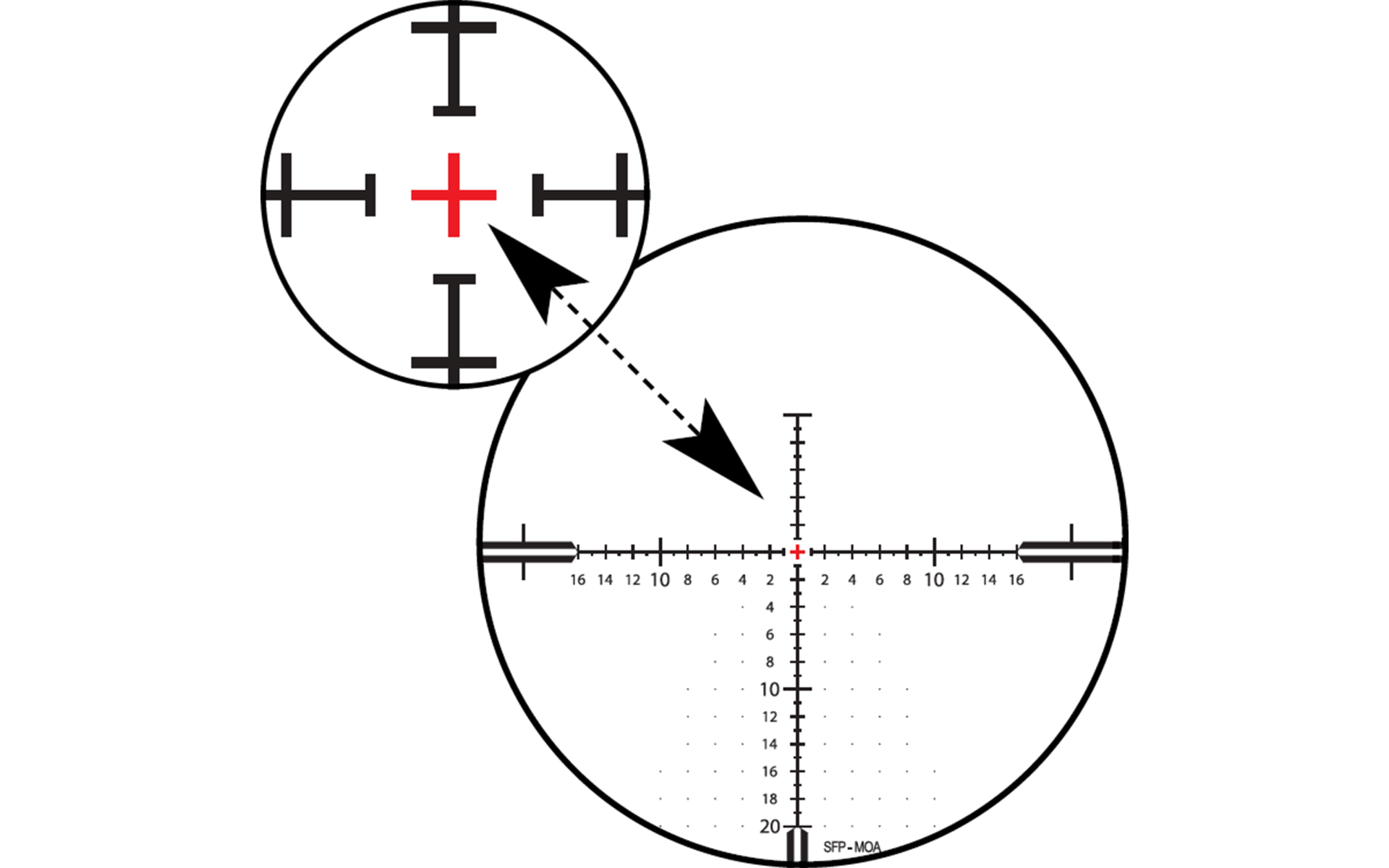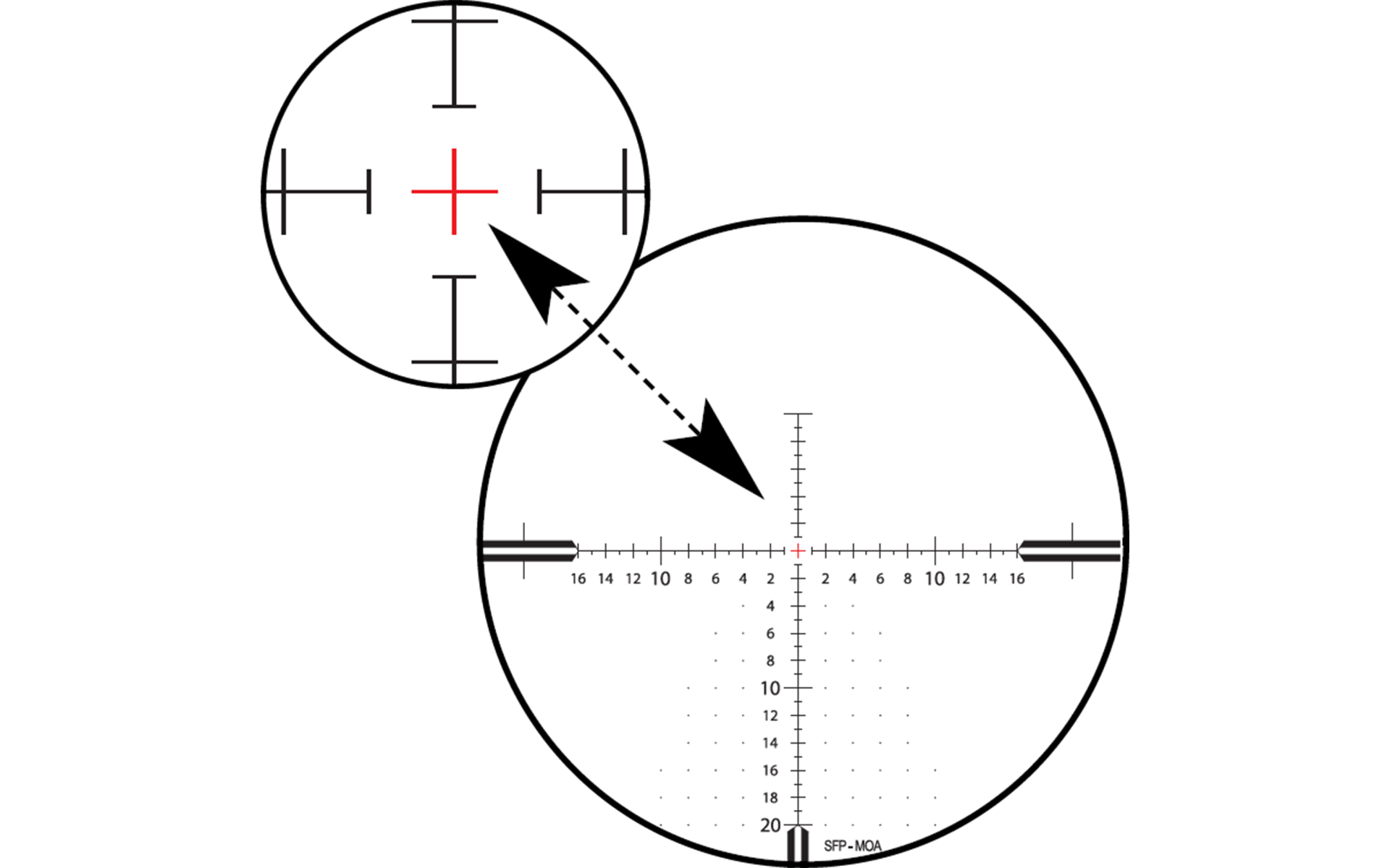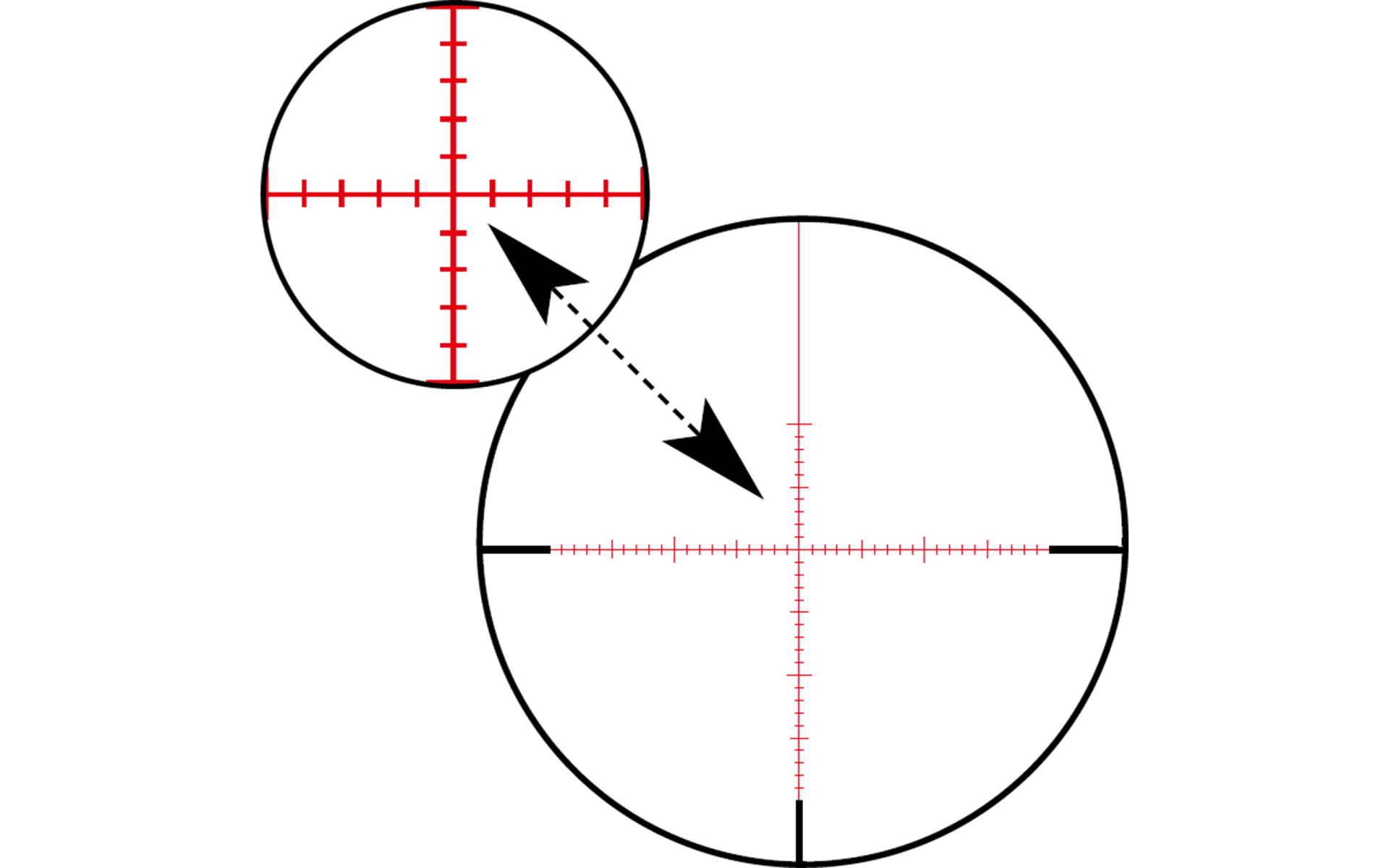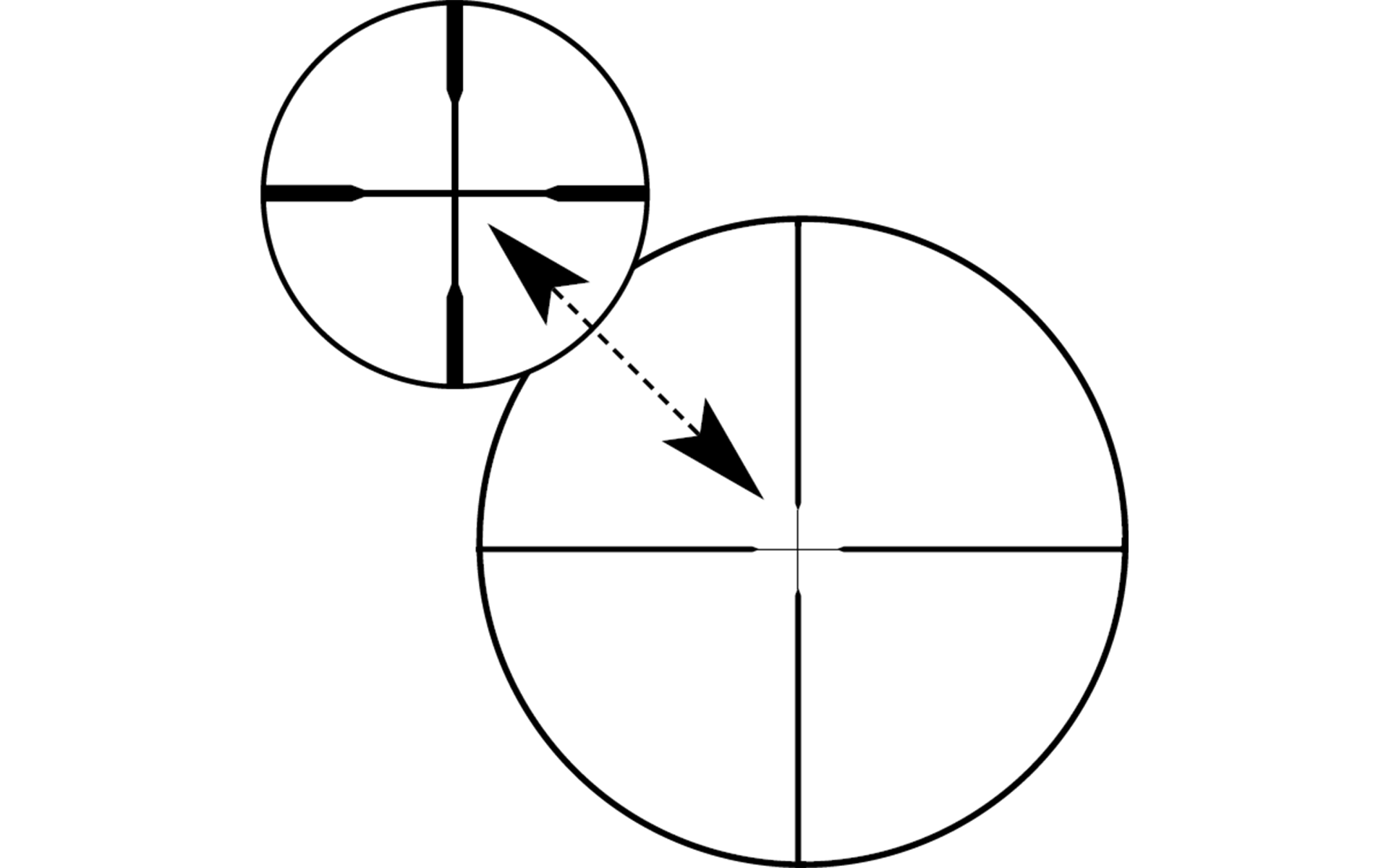 Le réticule 20 très fin est dans le second plan focal. Durant la chasse de nuit, il vous permet de mettre votre fusil sur l'épaule et de viser de manière très précise même sur de longues distances. La transition des barres aux lignes fines au centre a une pointe en forme de flèche dans le réticule 20. Cela vous donne la possibilité de viser de manière extrêmement précise les petites cibles.