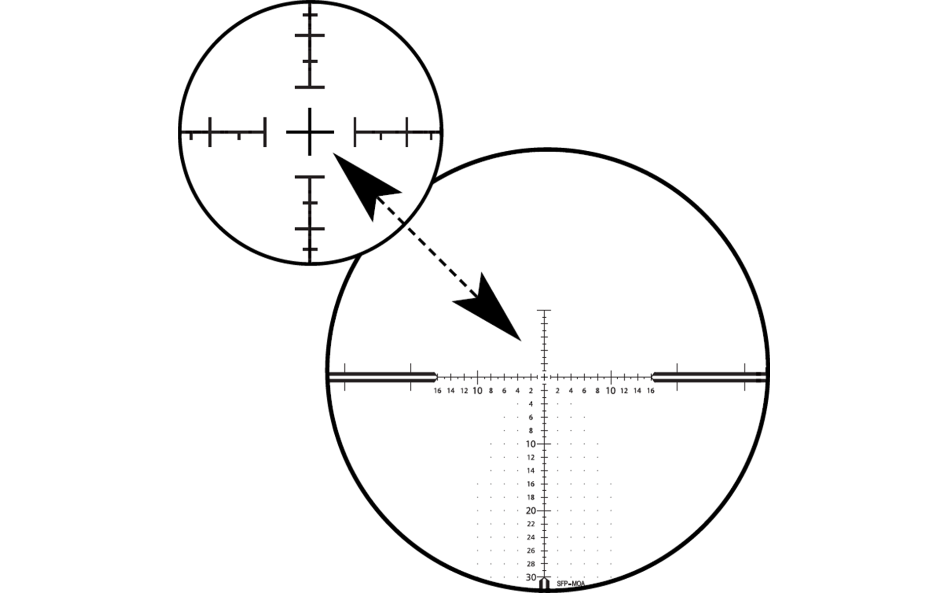 Le réticule balistique ZEISS ZMOA est dans le second plan focal et dispose d'une couverture de 2 MOA (ZMOA-2) entre les marques pointillées au grossissement de référence de la lunette de visée correspondante. Comme les marques pointillées sont uniquement affichées le long des viseurs, le tireur conserve une excellente vue d'ensemble du champ complet de vision. Elles sont adaptées à la fois à la compensation rapide de la dérive de la balle et de la correction de la dérive du vent. L'application ZEISS Hunting peut être utilisée pour déterminer rapidement et précisément les deux valeurs pour pratiquement toutes les munitions et aussi pour afficher les valeurs de distance dans une représentation visuelle du réticule.