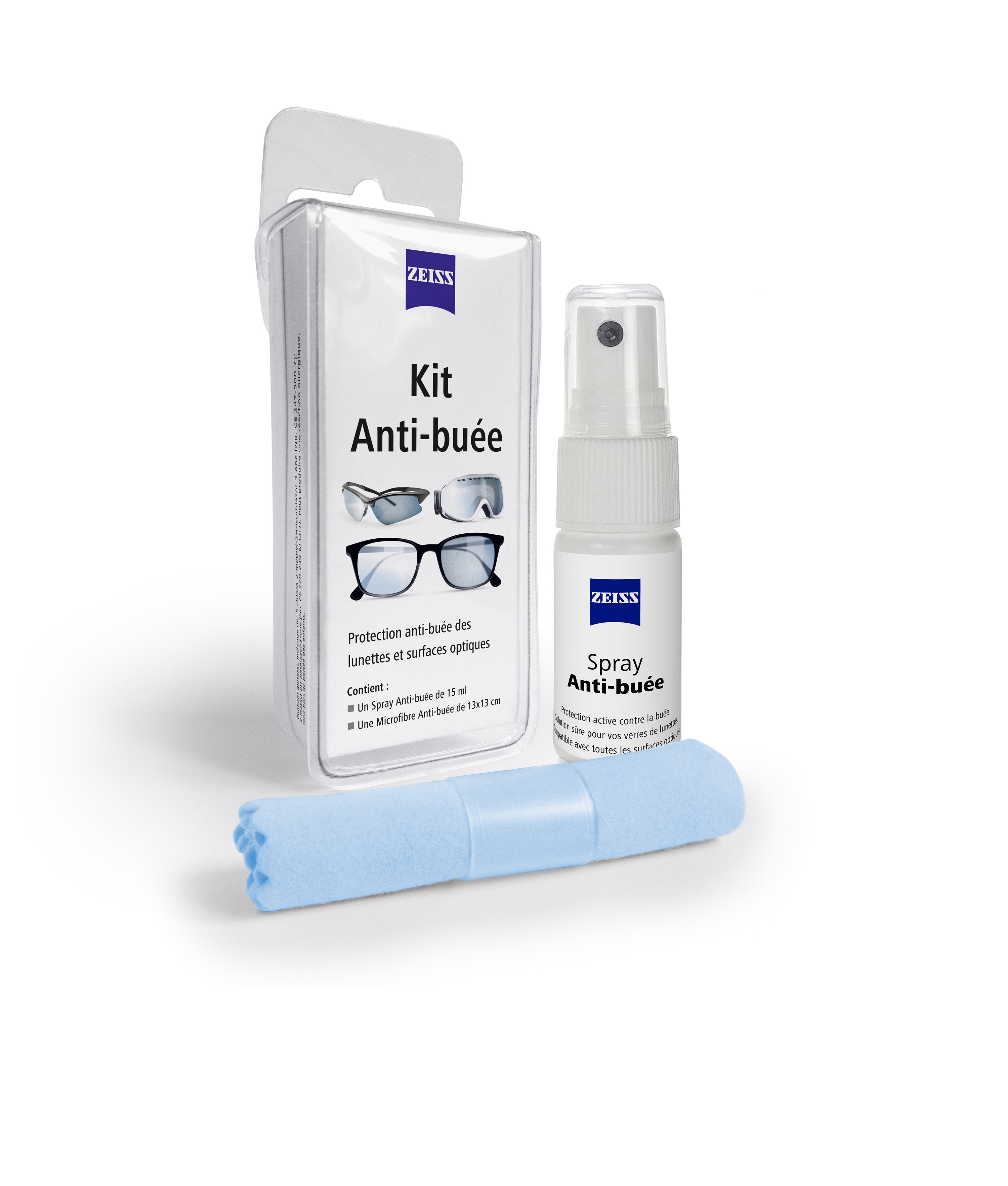 • un spray ZEISS anti-buée, qui laisse une fine pellicule hydrophile sur les verres et qui permet d’éviter la formation de gouttelettes d'eau condensées sur la surface des verres, ce qui empêche la formation de buée. Une technologie douce qui n’endommage en aucun cas la qualité des verres.